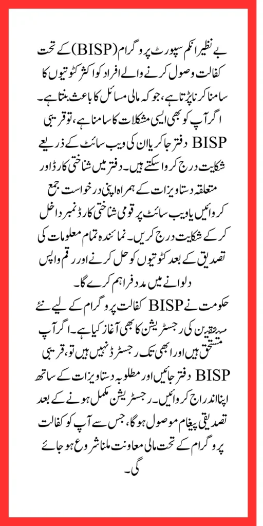 Visit your nearest BISP office or file a complaint online through the BISP website to resolve the issue. - How can I locate the nearest BISP office?